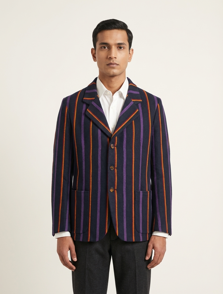 This vintage 1980s blazer features bold vertical stripes in black, purple, and orange. Perfect for adding a pop of color to any outfit, it combines a loose fit with classic design elements.