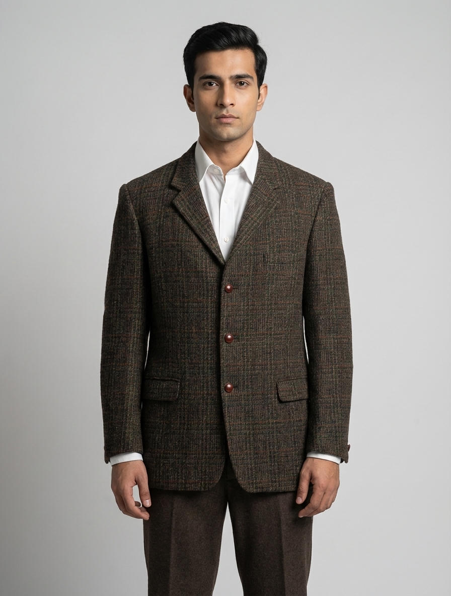 Colors: brown, orange | Pattern: checkered, pattern | Era Style: 1970s, classic menswear | Cut: structured fit, slightly oversized