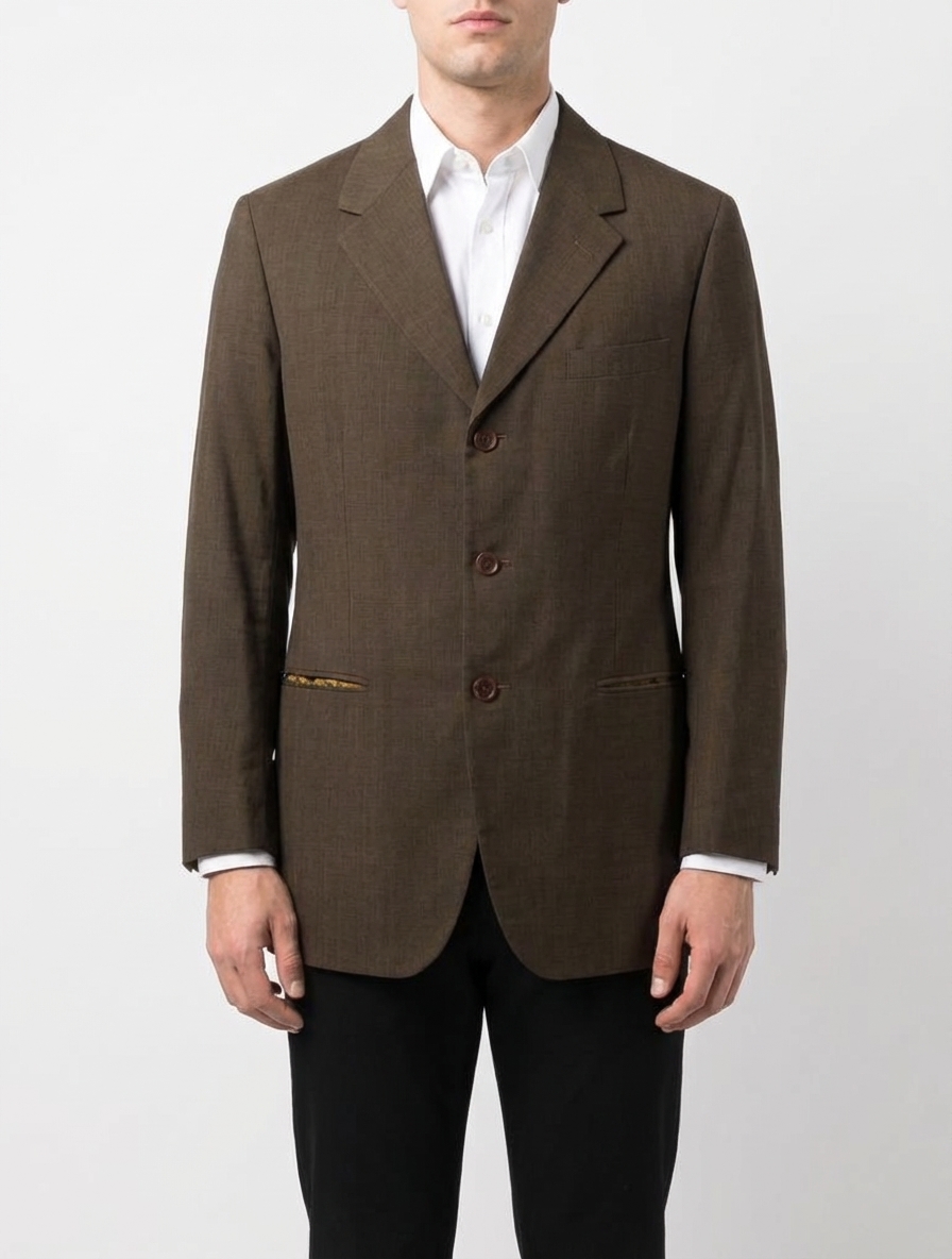 Colors: brown, yellow | Pattern: solid, with, patterned, lining | Era Style: 1970s, tailored style | Cut: classic fit, structured shoulders