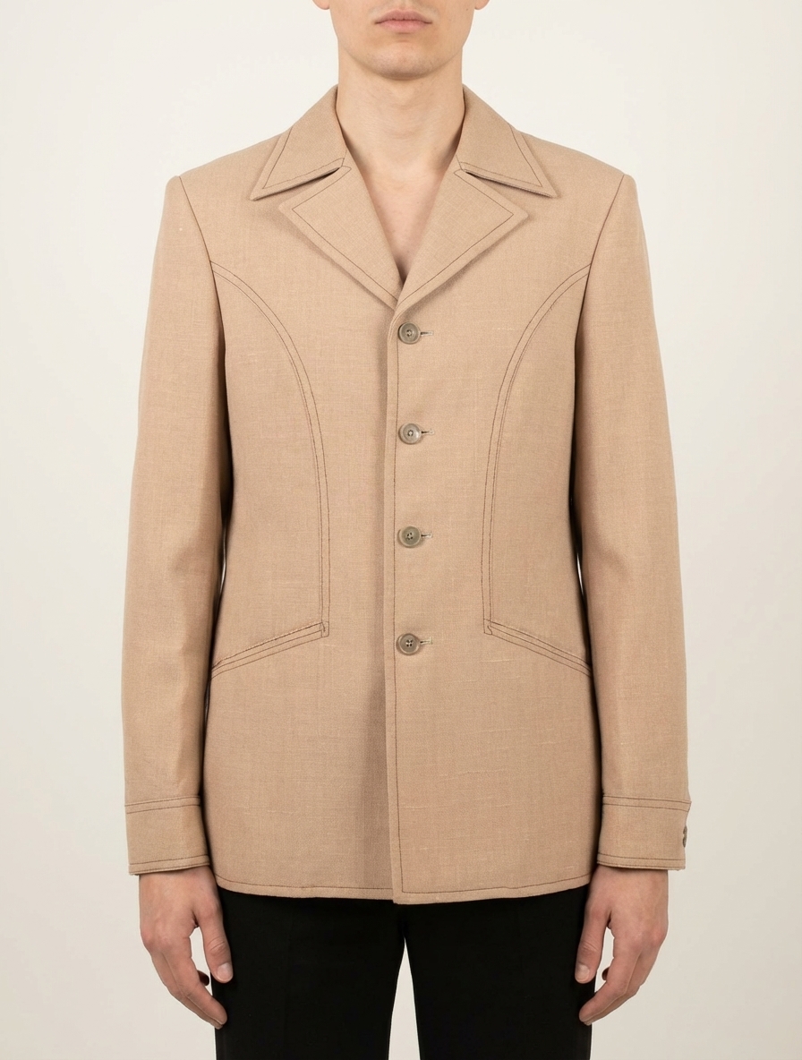 Colors: beige, tan | Pattern: solid, with, subtle, texture | Era Style: 1970s, tailored style | Cut: boxy, fit, with, structured, shoulders