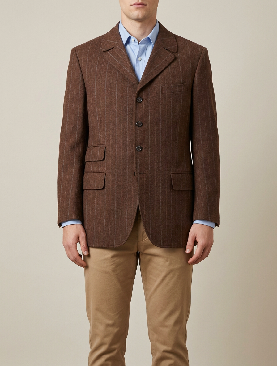 Colors: brown, tan | Pattern: pinstripe | Era Style: 1970s, tailored style | Cut: structured, fitted