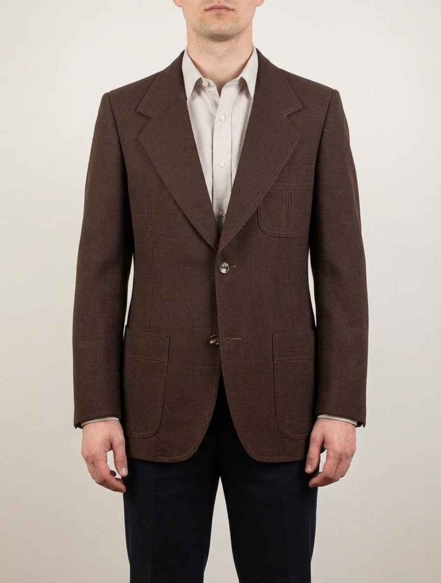 Colors: brown, tan | Pattern: Solid | Era Style: 1970s, wide lapels, patch pockets | Cut: Tailored, slightly boxy fit
