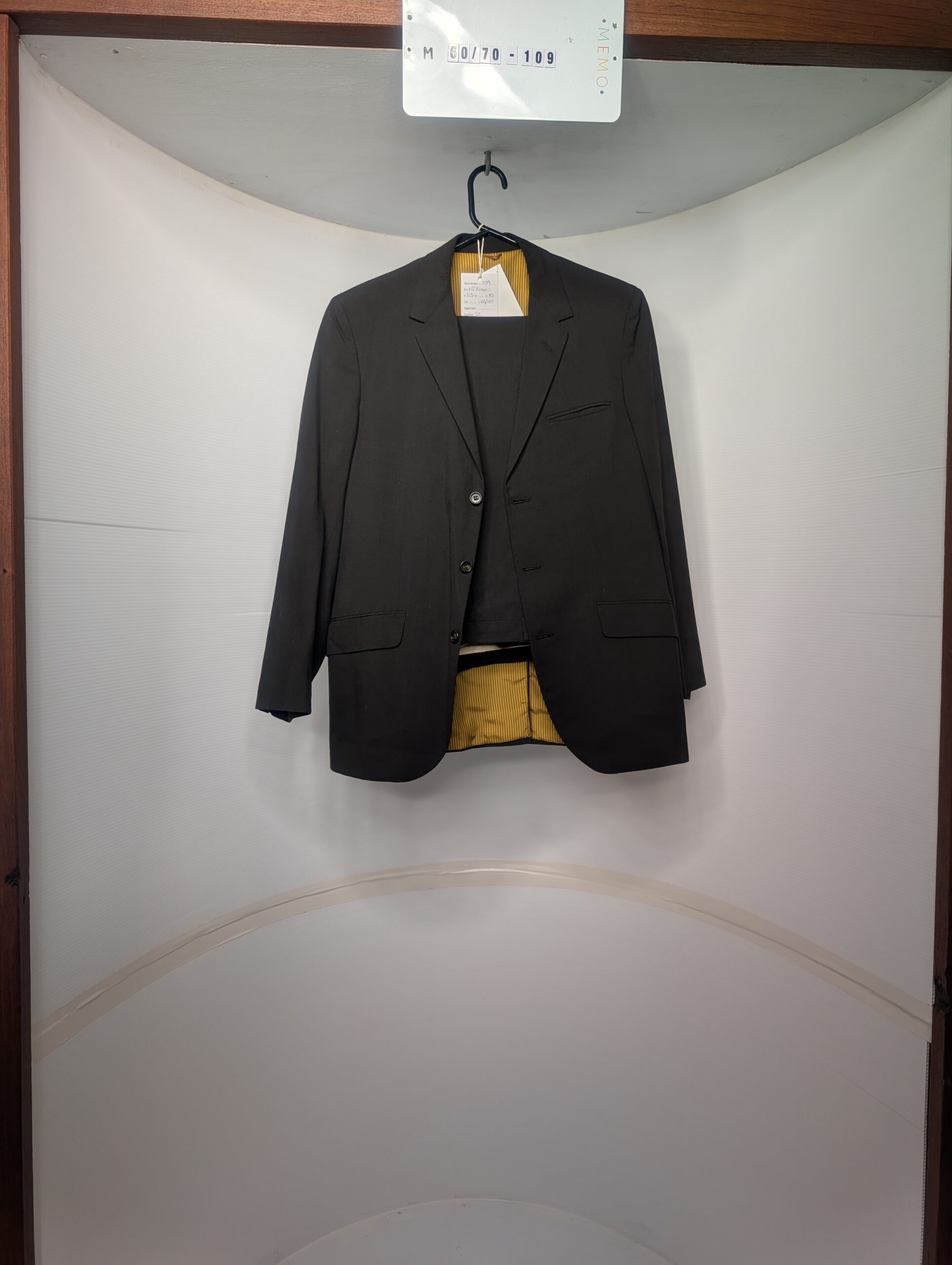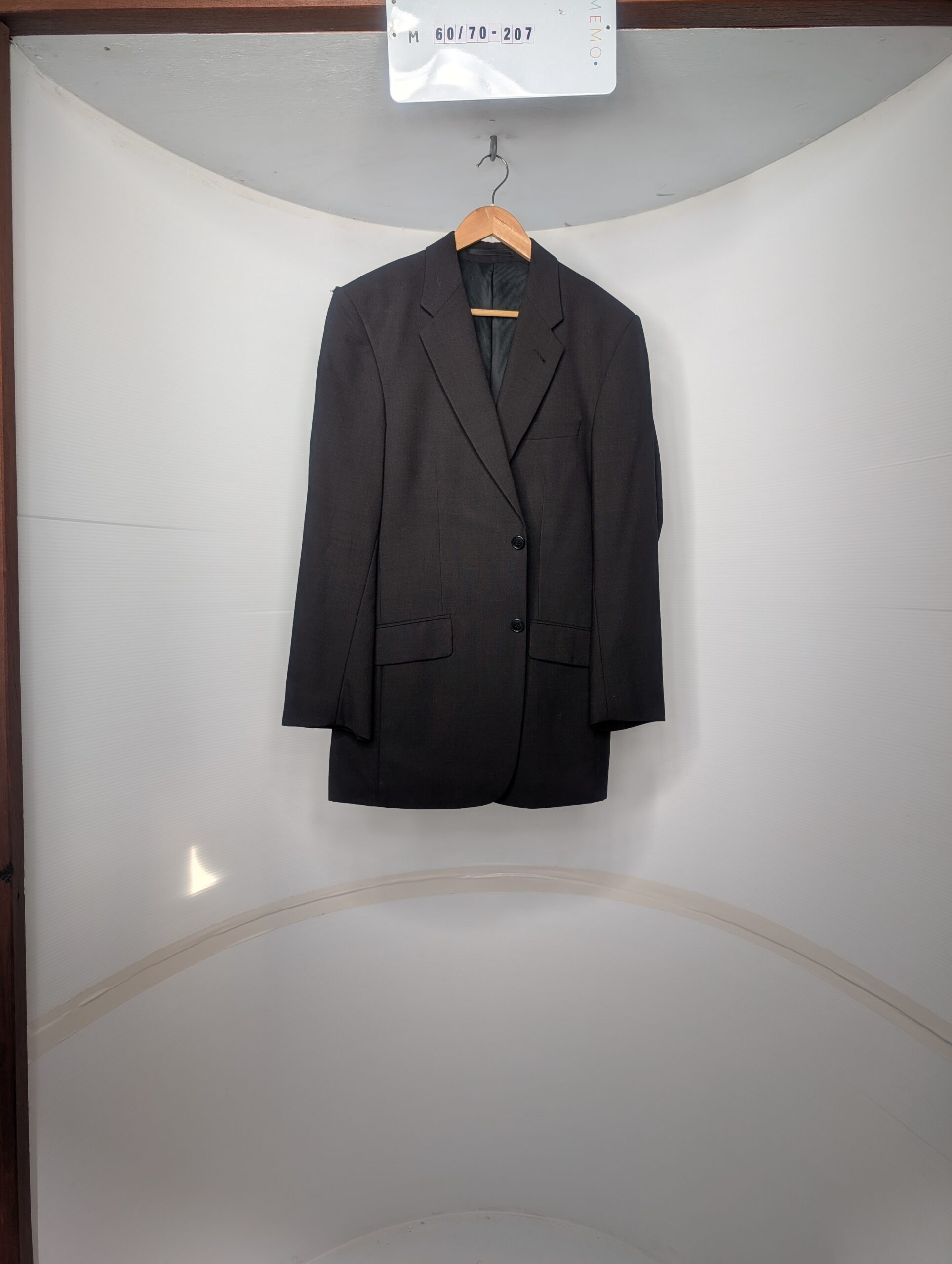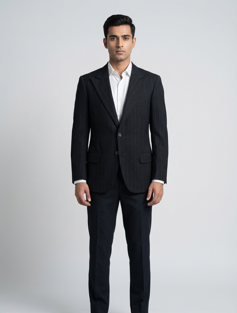 Colors: navy, black | Pattern: pinstripe | Era Style: 1980s, classic business style | Cut: tailored fit, structured
