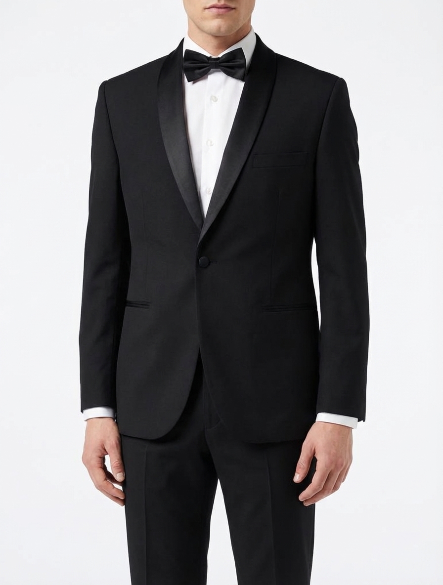 Classic vintage tuxedo jacket perfect for formal events. Features a sleek black wool blend with a luxurious satin shawl lapel and single-button closure.