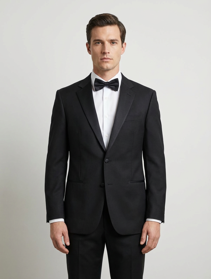 Classic black tuxedo jacket perfect for formal events. Features a satin shawl lapel and a timeless single-breasted design.