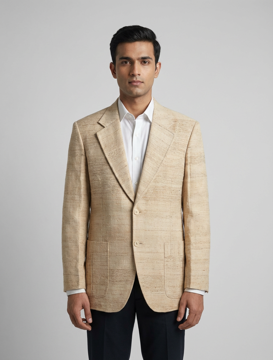 Colors: beige, brown | Pattern: subtle, textured, pattern | Era Style: 1970s, classic tailored style | Cut: structured, fit, with, a, slightly, relaxed, silhouette