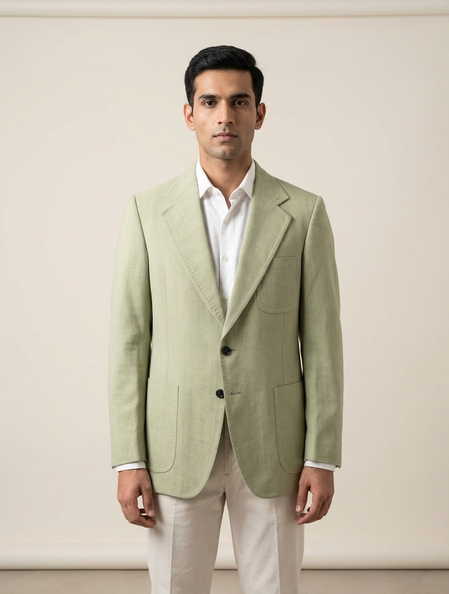 Colors: green, beige | Pattern: subtle texture, possibly herringbone | Era Style: 1970s, tailored fit | Cut: structured, slightly oversized