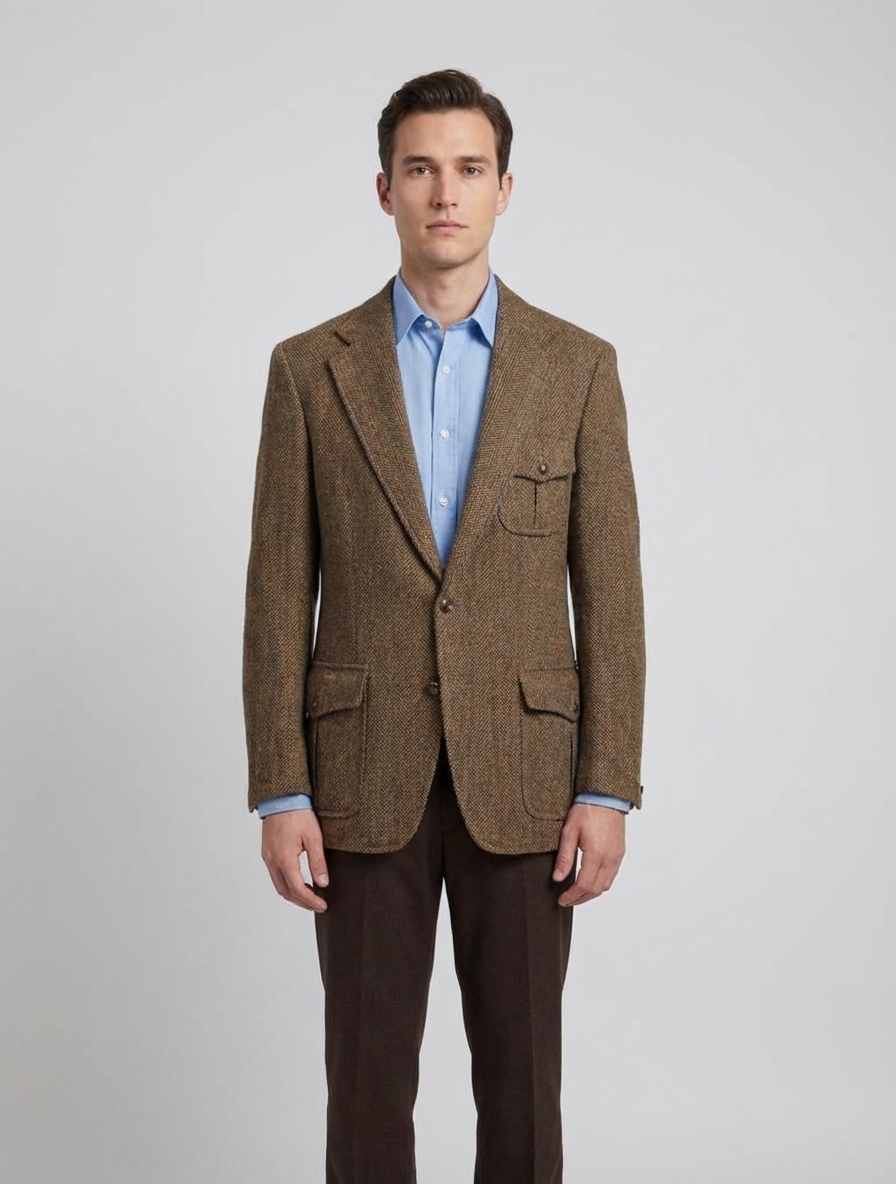 Colors: brown, orange | Pattern: herringbone | Era Style: 1960s, classic menswear | Cut: tailored fit, structured