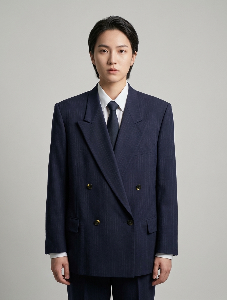 Colors: navy, blue | Pattern: pinstripe | Era Style: 1980s, power suit style | Cut: structured, oversized fit