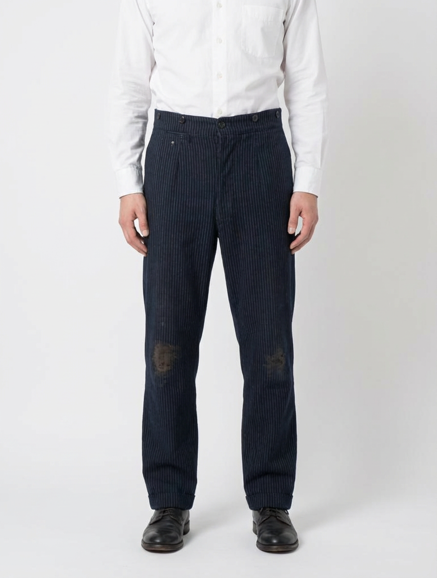 These vintage black pinstripe corduroy trousers feature a classic workwear design with a button fly and high waist. Perfect for adding a touch of retro style to your wardrobe.
