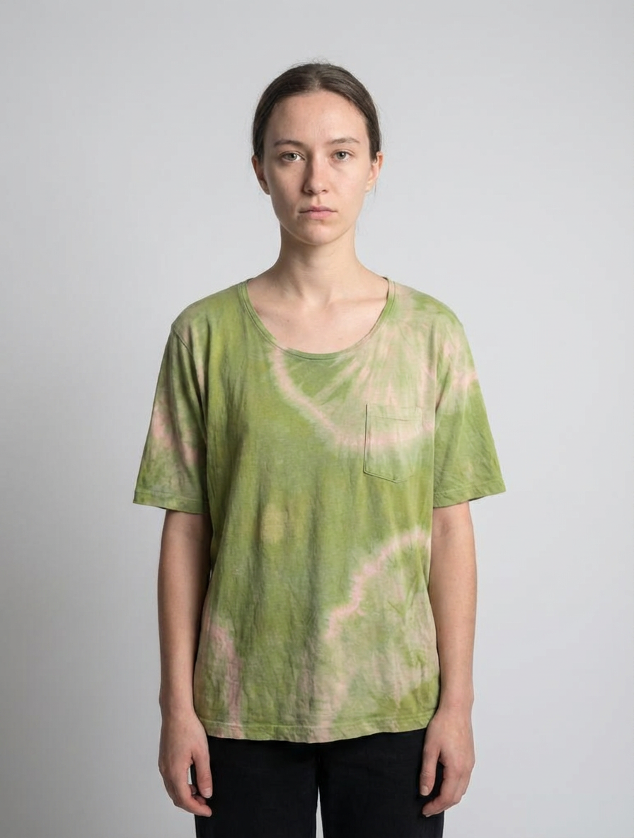 Colors: green, pink | Pattern: tie-dye | Era Style: 1970s, bohemian style | Cut: relaxed fit, short sleeves
