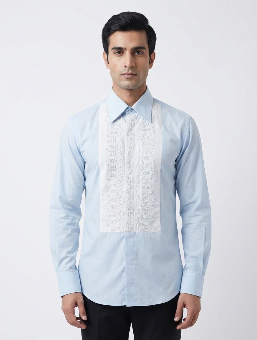 This vintage 1970s dress shirt features a light blue cotton blend fabric with a striking cream embroidered front panel. Perfect for adding a touch of retro style to any outfit.