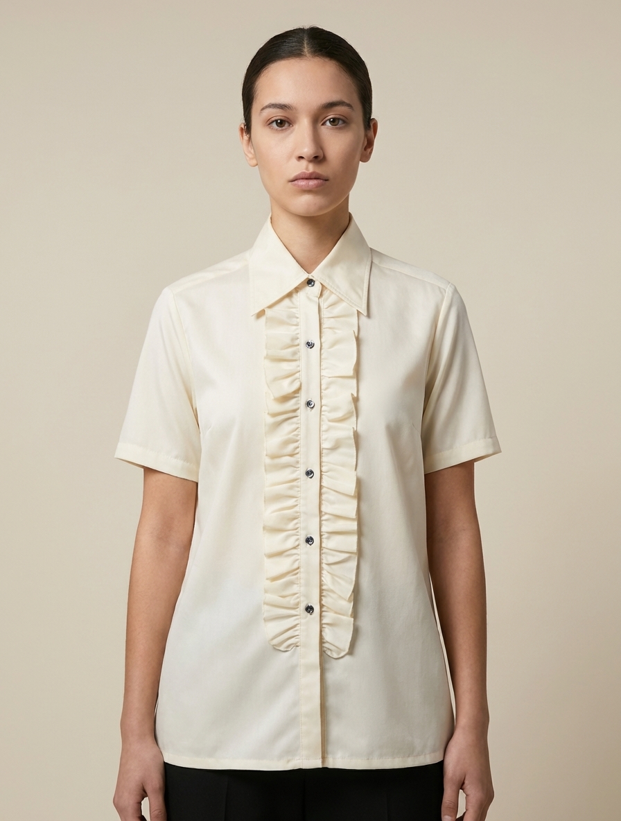 Colors: cream | Pattern: solid | Era Style: 1970s, vintage style | Cut: loose, fit, with, ruffled, front