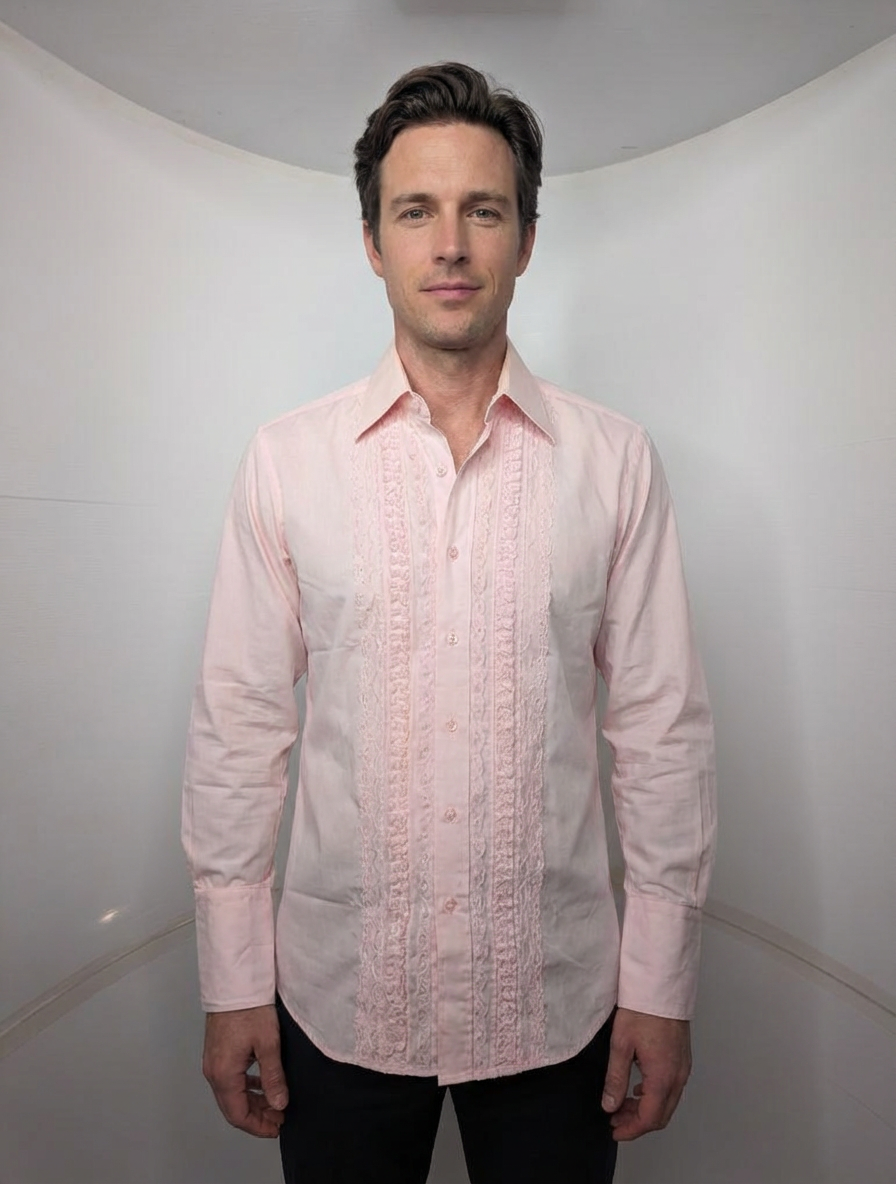This charming vintage button-up shirt from the 1970s features a smooth cotton blend fabric in a soft light pink hue. The shirt is adorned with a decorative embroidered front placket and a stylish wide collar, making it a perfect addition to any retro wardrobe.