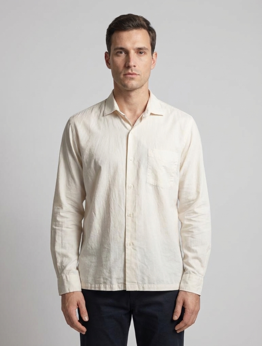 A classic cream-colored button-down shirt reminiscent of the 1970s minimalist style. Features a relaxed fit and lightweight fabric, perfect for a casual vintage look.
