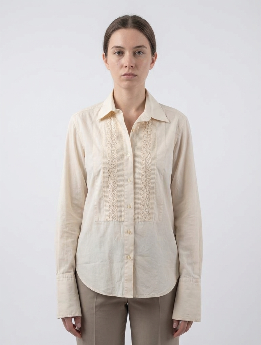 Elegant cream-colored button-down shirt featuring textured vertical panels. A classic piece with a timeless design, perfect for adding a touch of sophistication to any outfit.