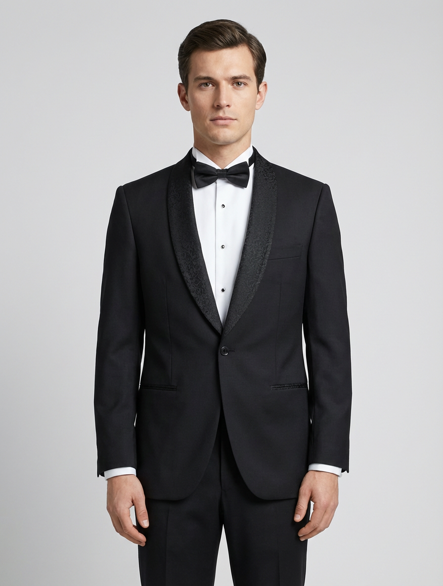 Colors: black | Pattern: solid | Era Style: 1980s, classic formal wear | Cut: tailored fit, structured silhouette