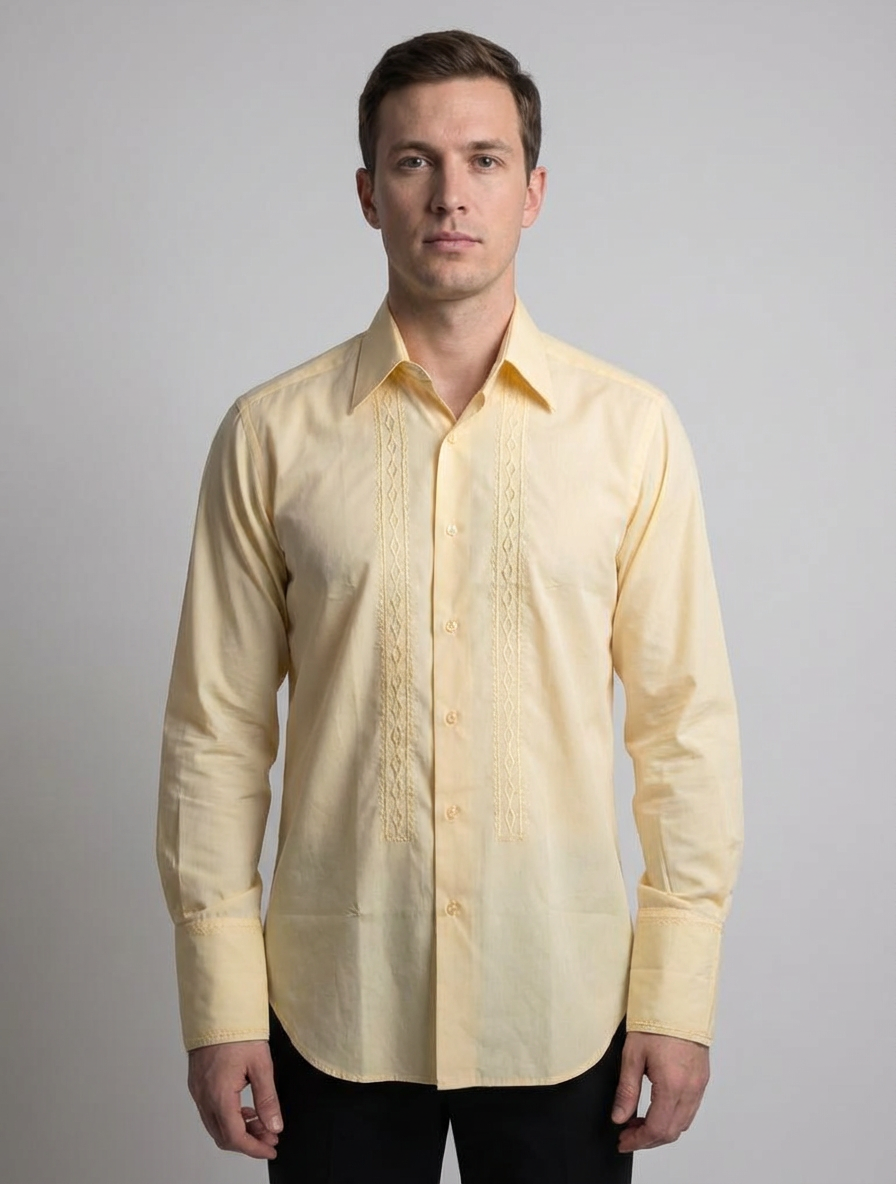 This vintage 1970s dress shirt features a soft pale yellow hue and intricate decorative stitching along the placket. Perfect for adding a retro touch to any outfit.