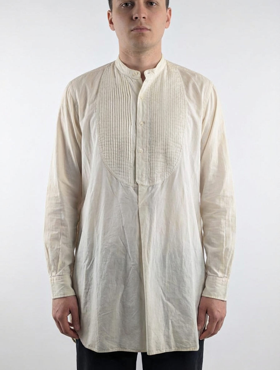This vintage cream button-down shirt features a lightweight cotton fabric with a slightly crinkled texture. Perfect for layering or wearing on its own, it showcases a classic design with pleated detailing and a high collar.