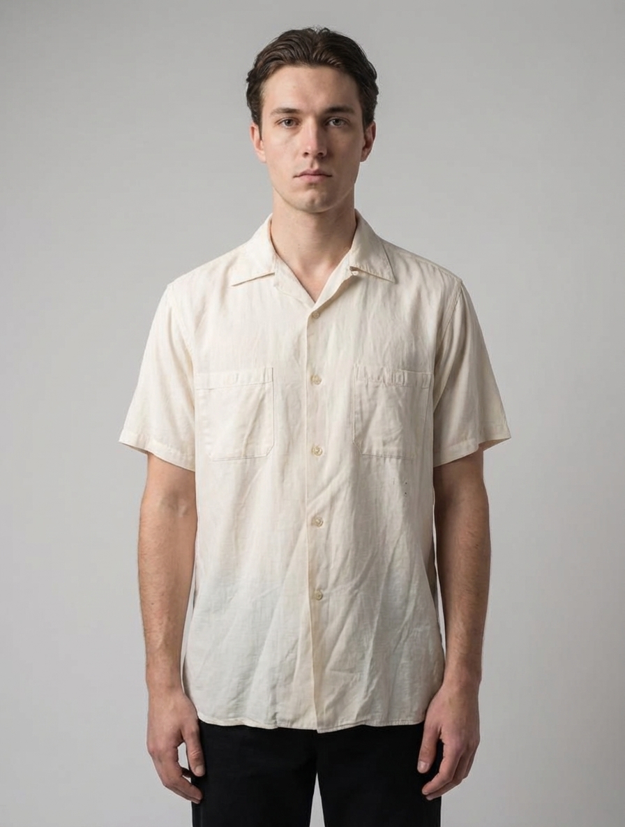 This vintage cream short-sleeve shirt from the 1950s features a relaxed fit and a classic camp collar. Perfect for casual outings or layering, it showcases timeless style with two front pockets.