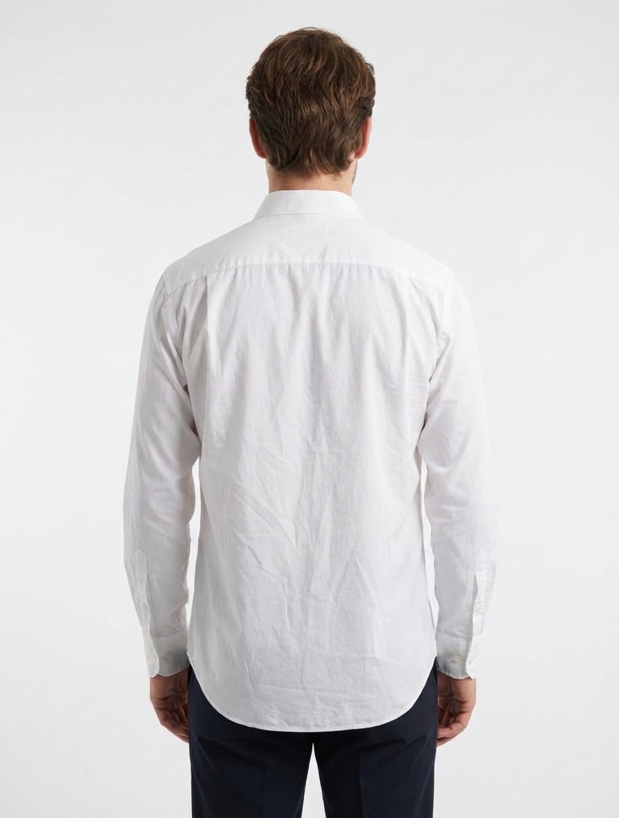 This classic white button-up shirt is a versatile addition to any wardrobe. Made from smooth cotton, it features long sleeves and a standard collar, perfect for both casual and formal occasions.