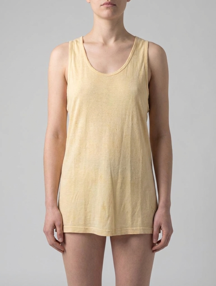 This vintage 90s tank top features a soft cotton fabric in a light beige color. Perfect for layering or casual wear, it offers a relaxed fit with wide armholes.