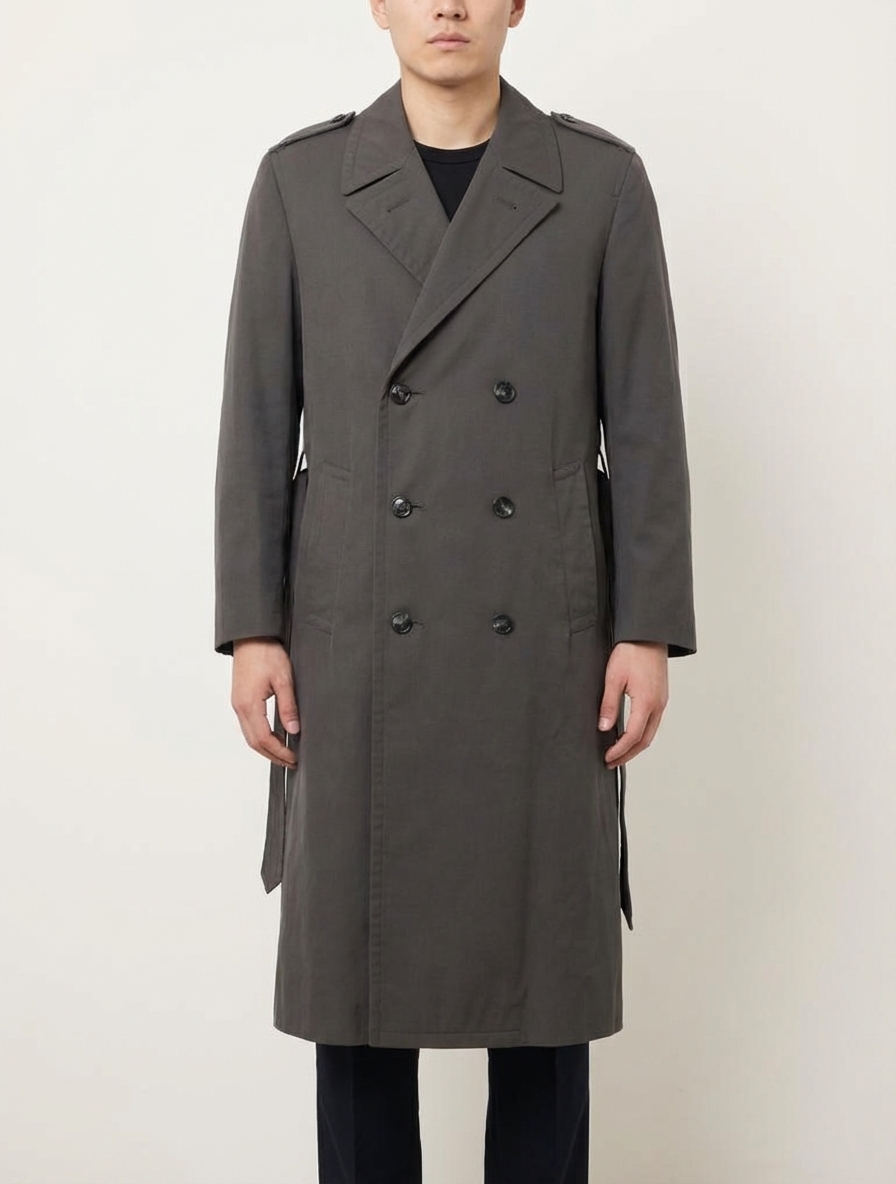 Classic military-style trench coat from the 1950s. Features a double-breasted design and a straight, longline silhouette. Perfect for adding a touch of vintage sophistication to your wardrobe.