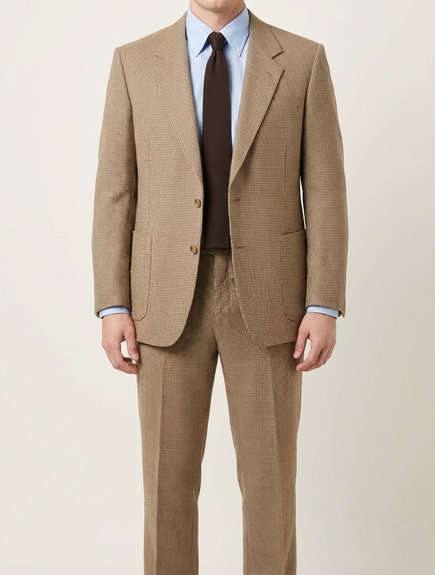 Colors: brown, beige | Pattern: houndstooth, pattern | Era Style: 1970s, classic menswear style | Cut: structured fit, slightly tailored