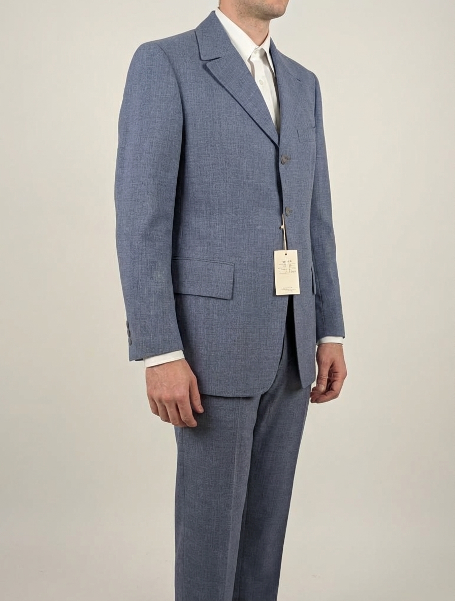 A classic vintage suit jacket from the 1960s or 1970s. Features a slim fit, light blue wool blend fabric, and a three-button closure.