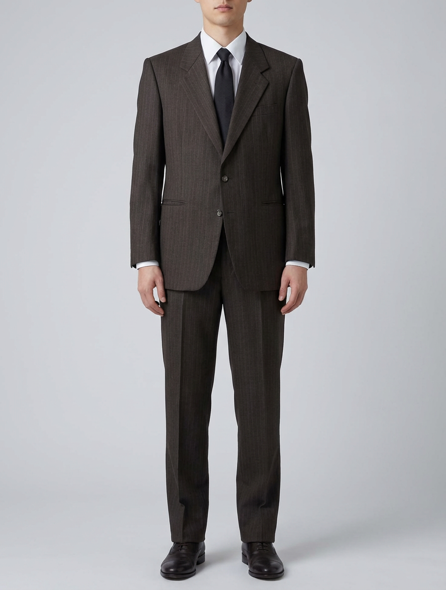 Colors: brown | Pattern: subtle, pinstripe | Era Style: 1990s, classic business style | Cut: tailored fit, structured shoulders