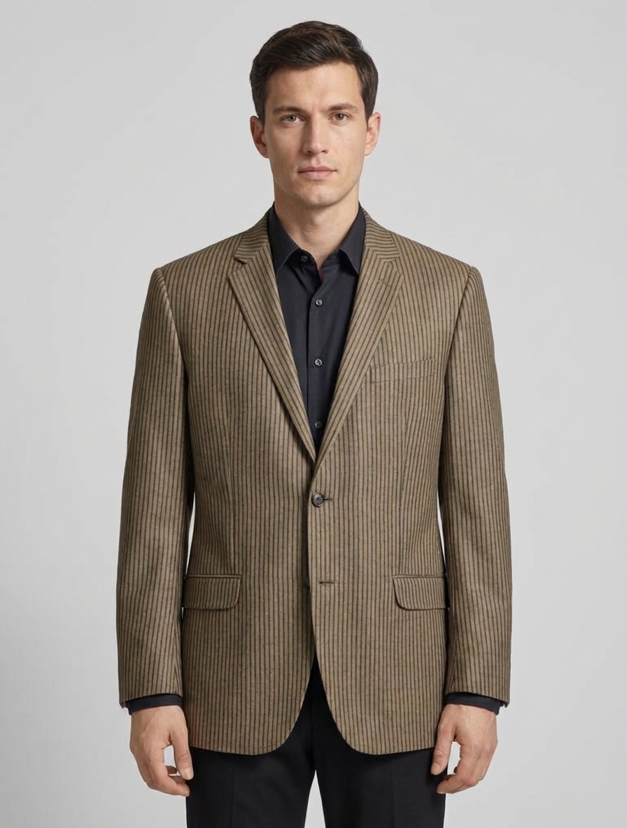 Colors: brown, cream | Pattern: pinstripe | Era Style: 1980s, tailored style | Cut: structured, regular fit