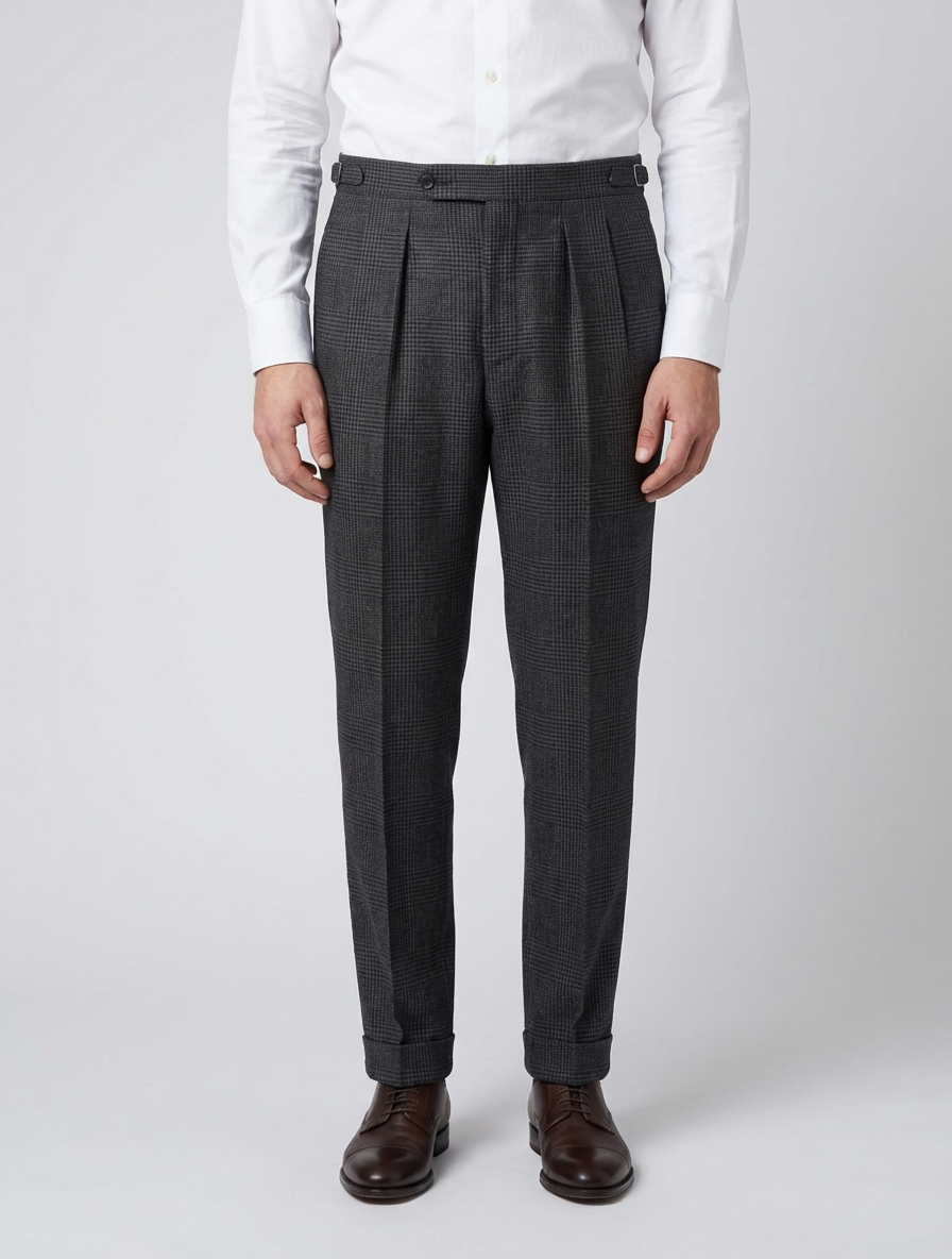 Colors: gray | Pattern: subtle, check, pattern | Era Style: 1980s, tailored style | Cut: slim fit, tapered leg