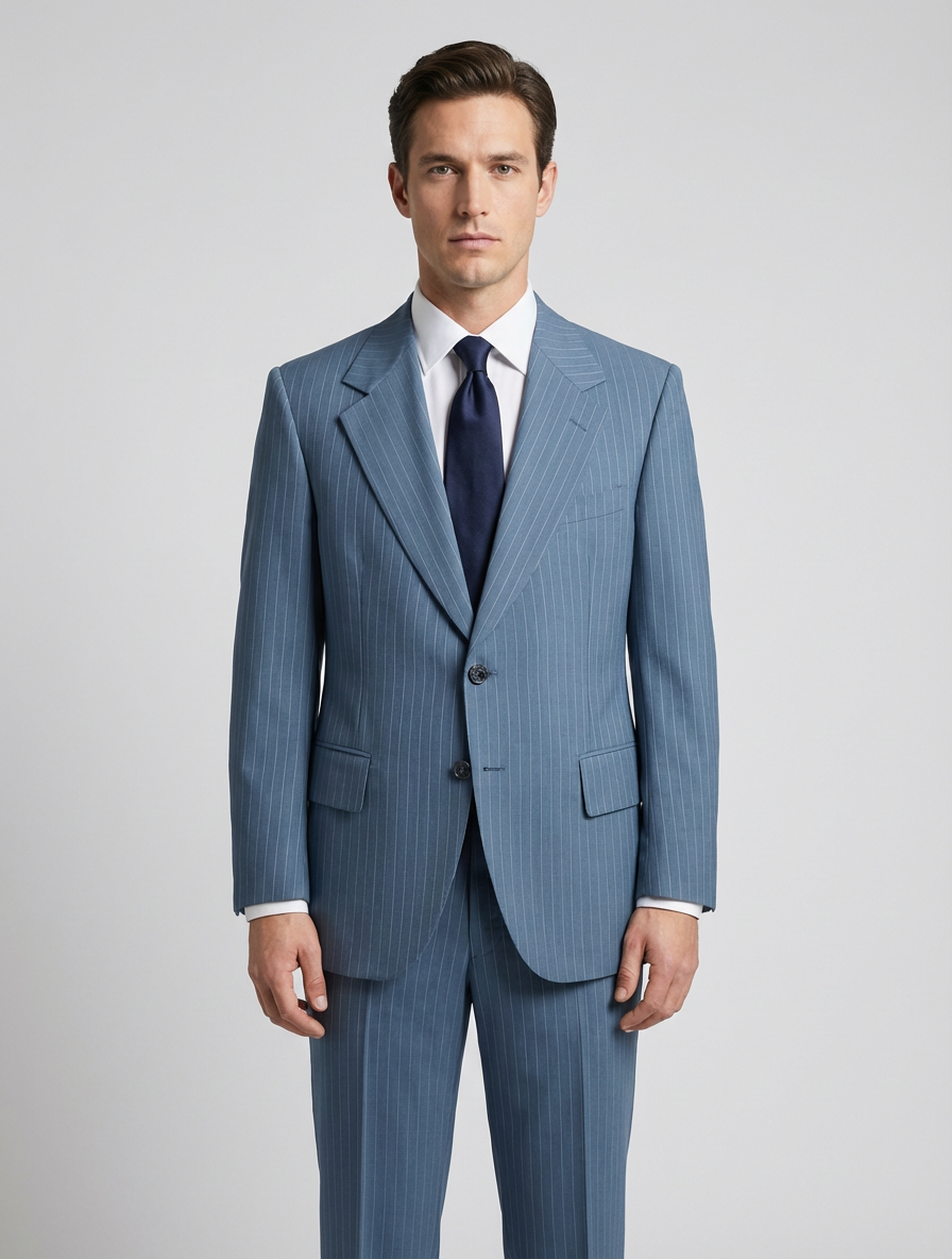Colors: light blue, white | Pattern: pinstripe | Era Style: 1980s, business casual | Cut: tailored fit, structured shoulders