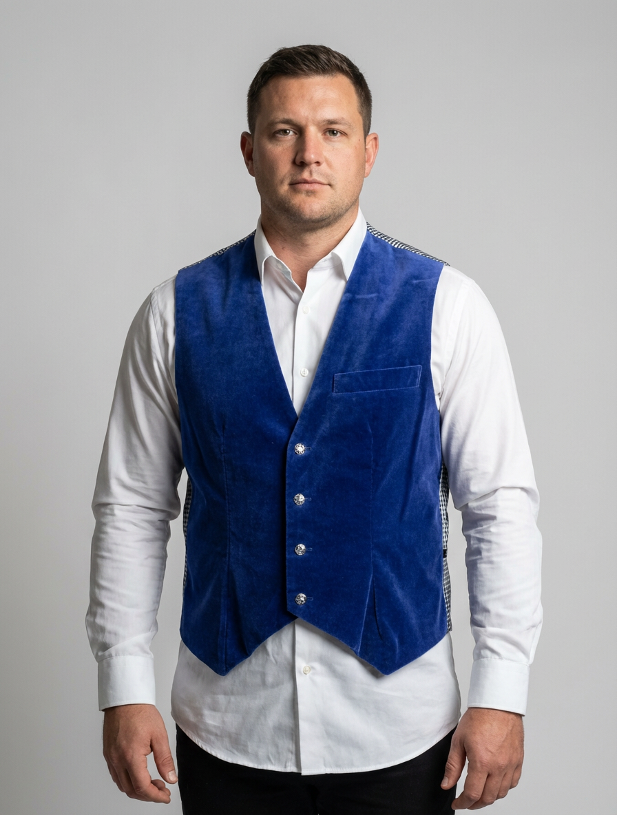 This vintage blue velvet vest adds a touch of elegance to any outfit. Perfect for layering, it features a fitted silhouette and a classic button closure.