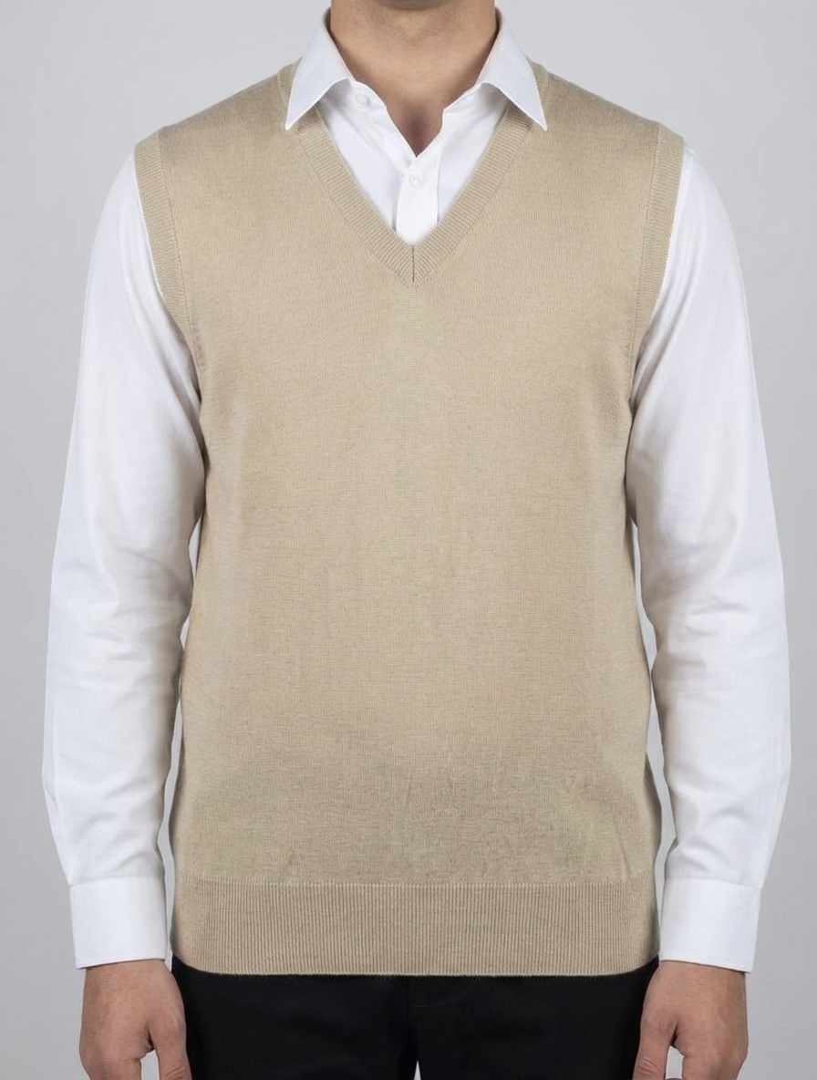 This stylish beige sleeveless sweater is perfect for layering or wearing on its own. Crafted from soft knit fabric, it features a flattering V-neck and ribbed edges for added texture.